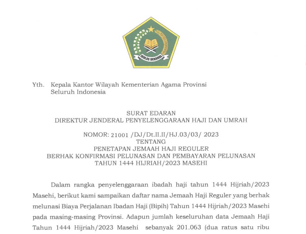 Daftar nama jemaah haji berhak lunasi Bipih 1444 H, bisa diakses melalui link berikut: https://bit.ly/JemaahBerhakLunasHajiReguler2023