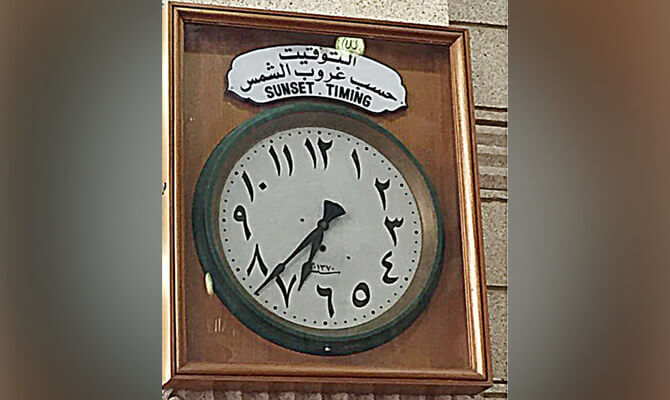 Ada sebuah jam di Masjid Nabawi, tepatnya di dekat Bab al-Salam, yang selalu menarik perhatian pengunjung Masjid karena waktunya berbeda dengan jam di Arab Saudi pada umumnya. Jam ini ada hubungannya dengan keputusan yang diambil oleh Raja Faisal, rahimahullah.