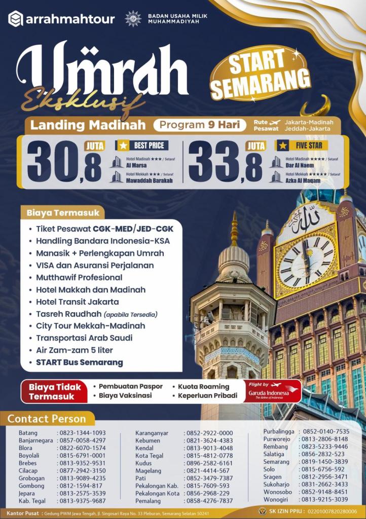 Perhatikan Detail Fasilitas Paket: Jangan mudah tergiur harga murah. Cek detail krusial seperti frekuensi makan, status bintang hotel, jenis maskapai penerbangan, dan ada tidaknya bimbingan ibadah.