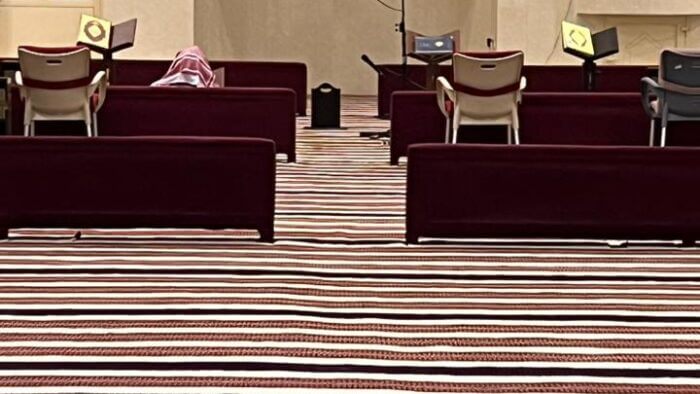 Pemandangan yang jarang ditemukan di masjid di Tanah Air juga adalah tersedianya kursi plastik portable yang mudah dipindahkan di dalam masjid Arab Saudi.