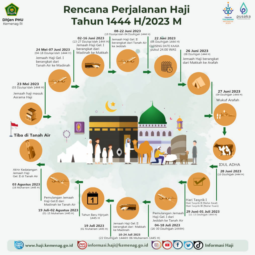 Wukuf di Arafah diperkirakan bertepatan dengan hari Selasa, 27 Juni 2023. Mulai 4 Juli 2023, jemaah haji Indonesia dipulangkan ke Tanah Air secara bertahap. Akhir kedatangan jemaah haji di Indonesia dijadwalkan pada 16 Muharram 1445/3 Agustus 2023.