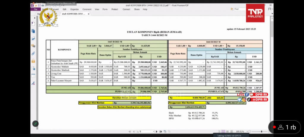Panitia kerja (Panja) Komisi VIII DPR RI dan Panja pemerintah sepakat bahwa rata-rata Biaya Penyelenggaraan Ibadah Haji (BPIH) 1444 H atau 2023 sebesar Rp 90.050.637,26 dari semula Rp 98.893.909. Adapun kesepakatan ini diambil dalam rapat Panja terakhir antara Komisi VIII DPR RI dengan pemerintah dan stakeholder terkait, sebelum pengambilan keputusan bersama Menteri Agama (Menag) Yaqut Cholil Qoumas. "Panja Komisi VIII DPR RI tentang BPIH 2023 dan Panja Pemerintah menyepakati besaran rata-rata BPIH untuk jemaah haji reguler sebesar Rp 90.050.637,26," kata Wakil Ketua Komisi VIII DPR Marwan Dasopang sebagai pemimpin rapat Panja Komisi VIII di Kompleks Parlemen, Senayan, Jakarta, Rabu (15/2/2023).